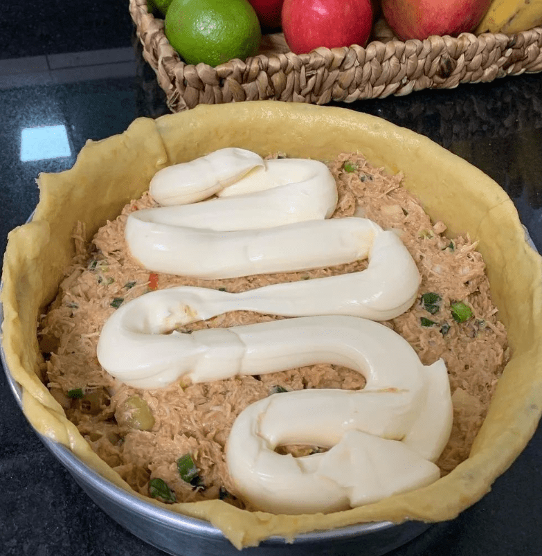 Depois é só abrir a outra parte da massa com o rolo no formato da tampa, cobrir, cortar os excessos e fechar as bordas. Se quiser pode decorar como eu fiz 🥰